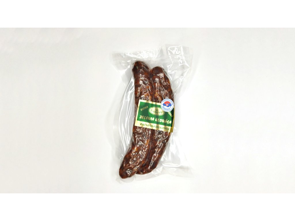 Bez éčiek. Čerstvá, vákuovo balená. Zloženie: Jelenie mäso 62%, bravčové mäso 26%, hovädzie mäso 10%, cesnak, zázvor, prírodné koreniny, jedlá soľ.