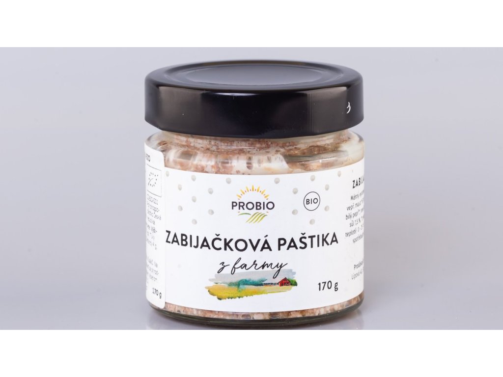 Receptúra starých rodičov - zabíjačková paštéta z farmy. Zloženie: bravčové mäso 50%, bravčová pečienka 30%, voda, cibuľa, biele korenie, nové korenie, muškátový orech, jedlá morská soľ 1,5%.